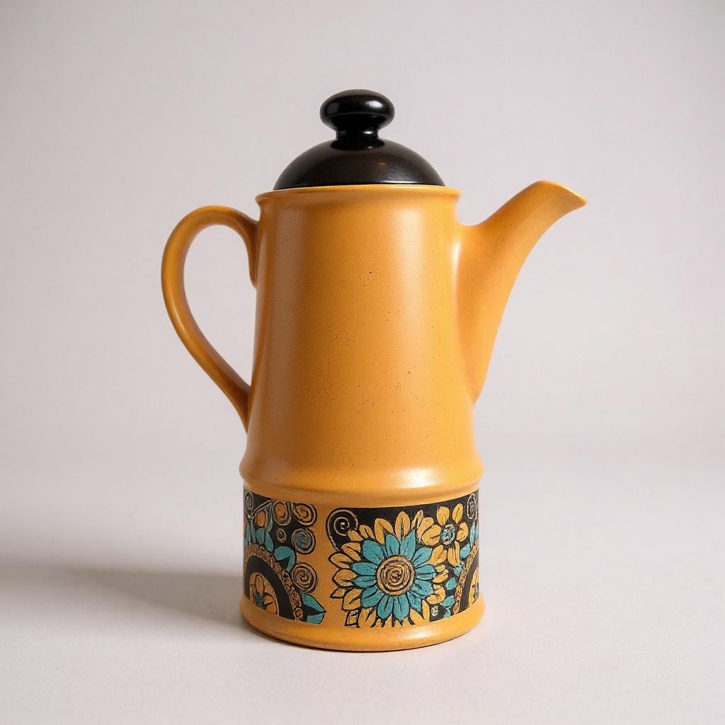 Lovely yellow/orange funky teapot with black lid and black/aqua floral design